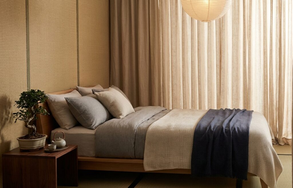 ベージュやグレー、ネイビーなどの落ち着いた色合いは、視覚的にもリラックス効果があり、就寝前の心を穏やかにしてくれます。