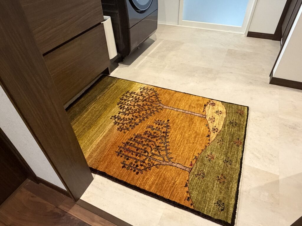 このギャッベは丘の上に2本の生命の木がたくさんの実をつけています。大地にしっかりと根をはり、家族の成長、子孫繁栄、健康長寿などの意味があります。毎日使う洗面所にはとてもいい模様ですね😊