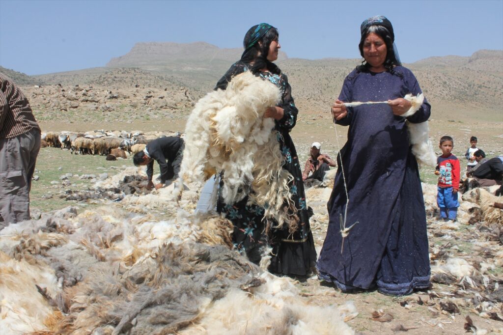 羊の毛を刈り、女性が羊毛を紡ぎ、撚り、糸にしていきます。