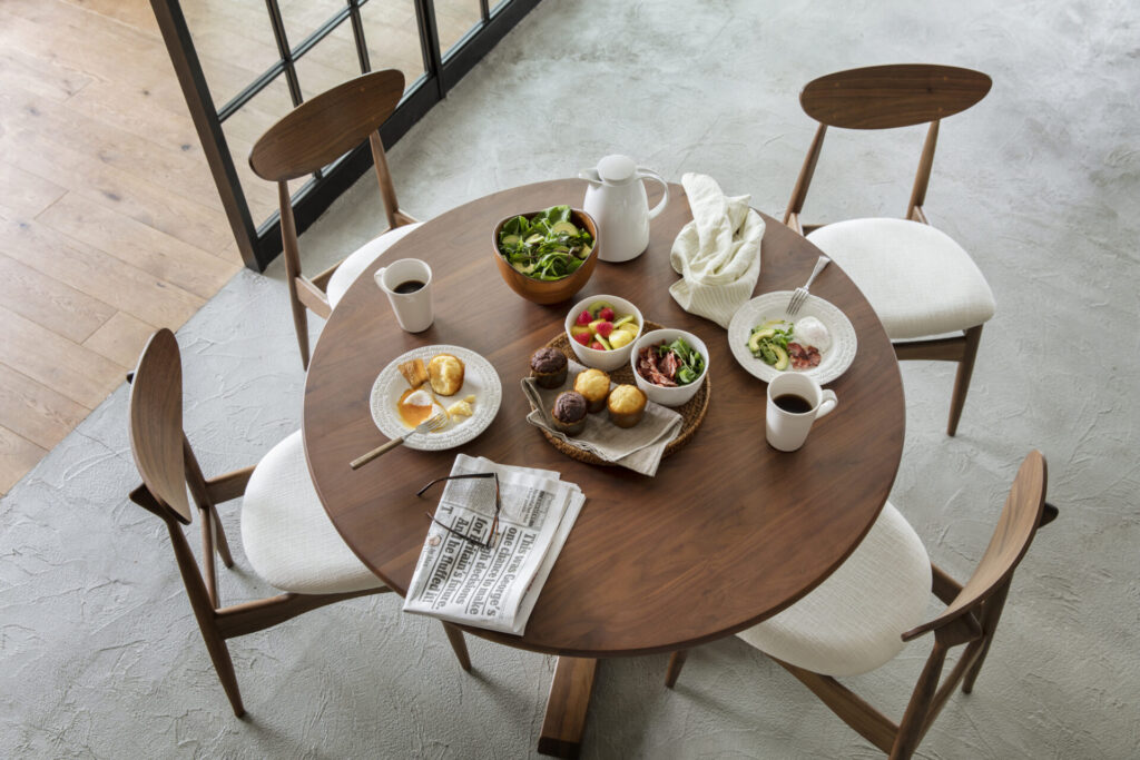 丸いダイニングテーブルは、使用人数に応じて椅子の配置を自由に調整できる柔軟性が魅力です。