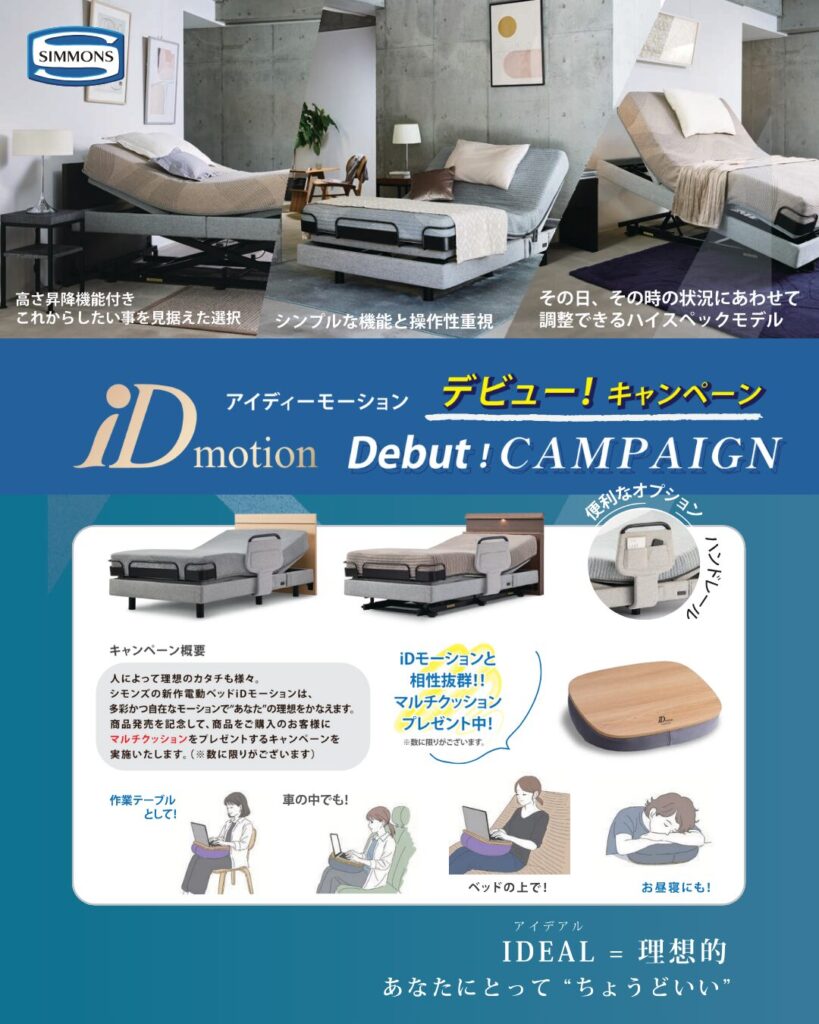 『iDモーション(電動フレーム+マットレスセット)をご購入いただいたお客様に、マルチクッションをプレゼント!